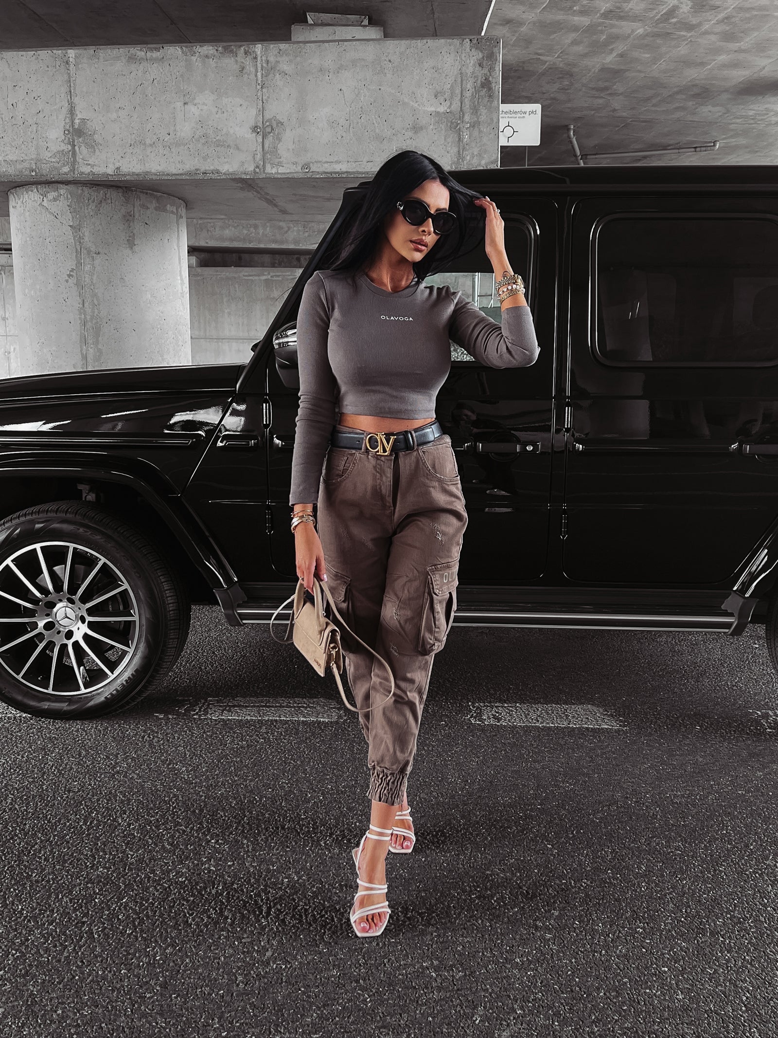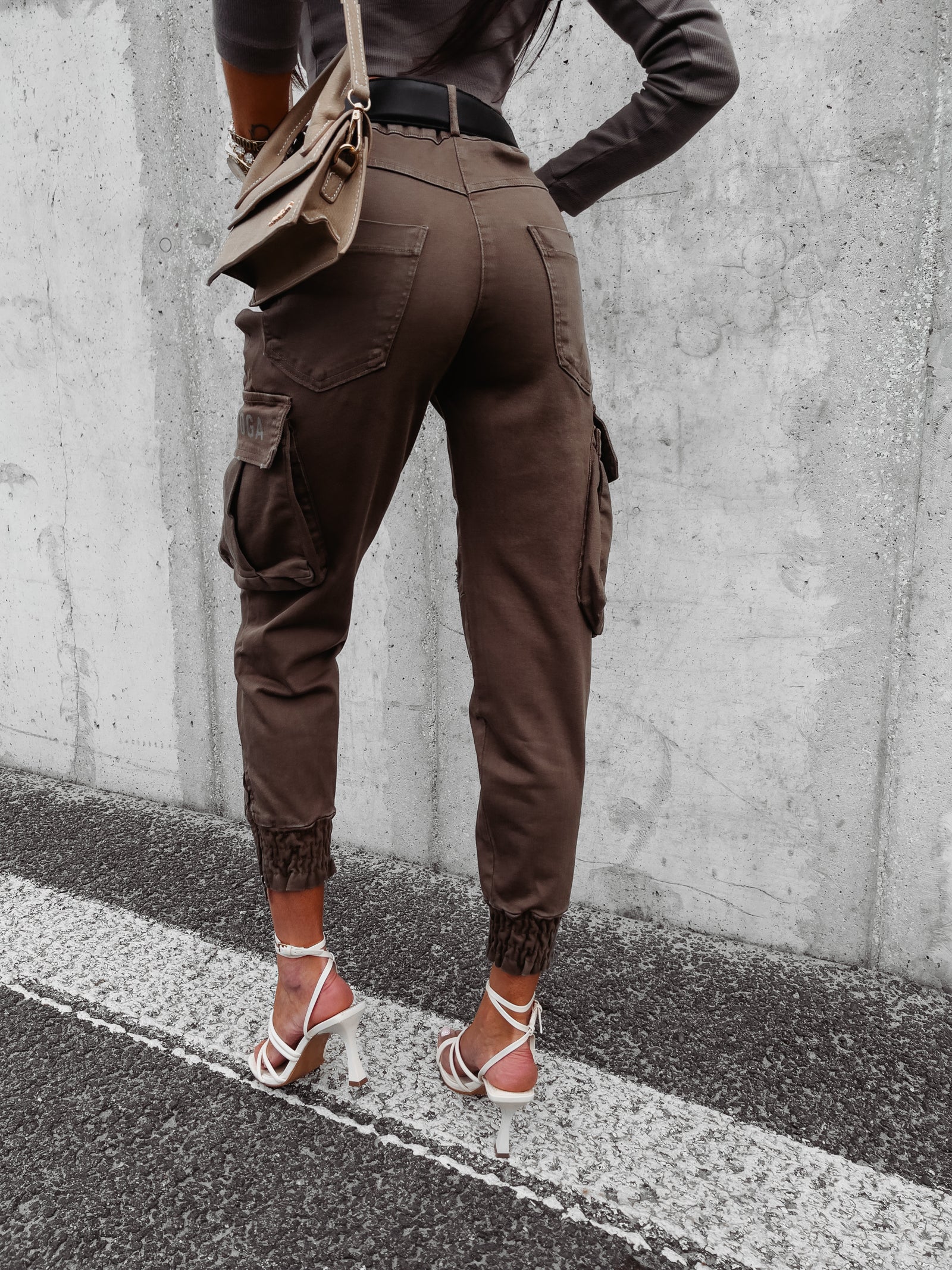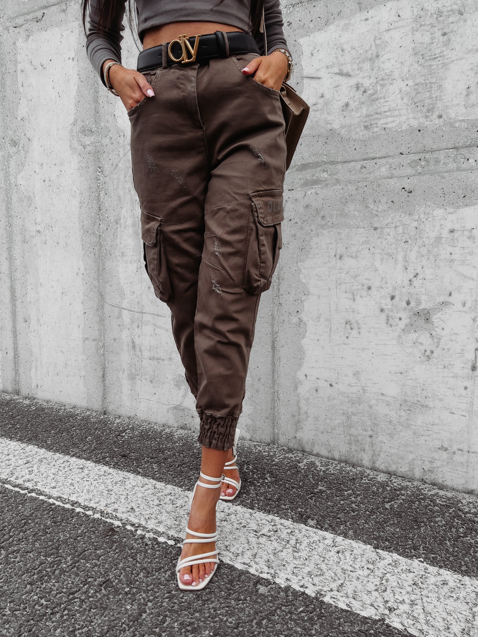 Női jogger cargo stílusú nadrág. Normál derék, cipzárral és gombbal záródik.Hosszú, laza lábszár, amelyet szűkítéssel zártunk le.