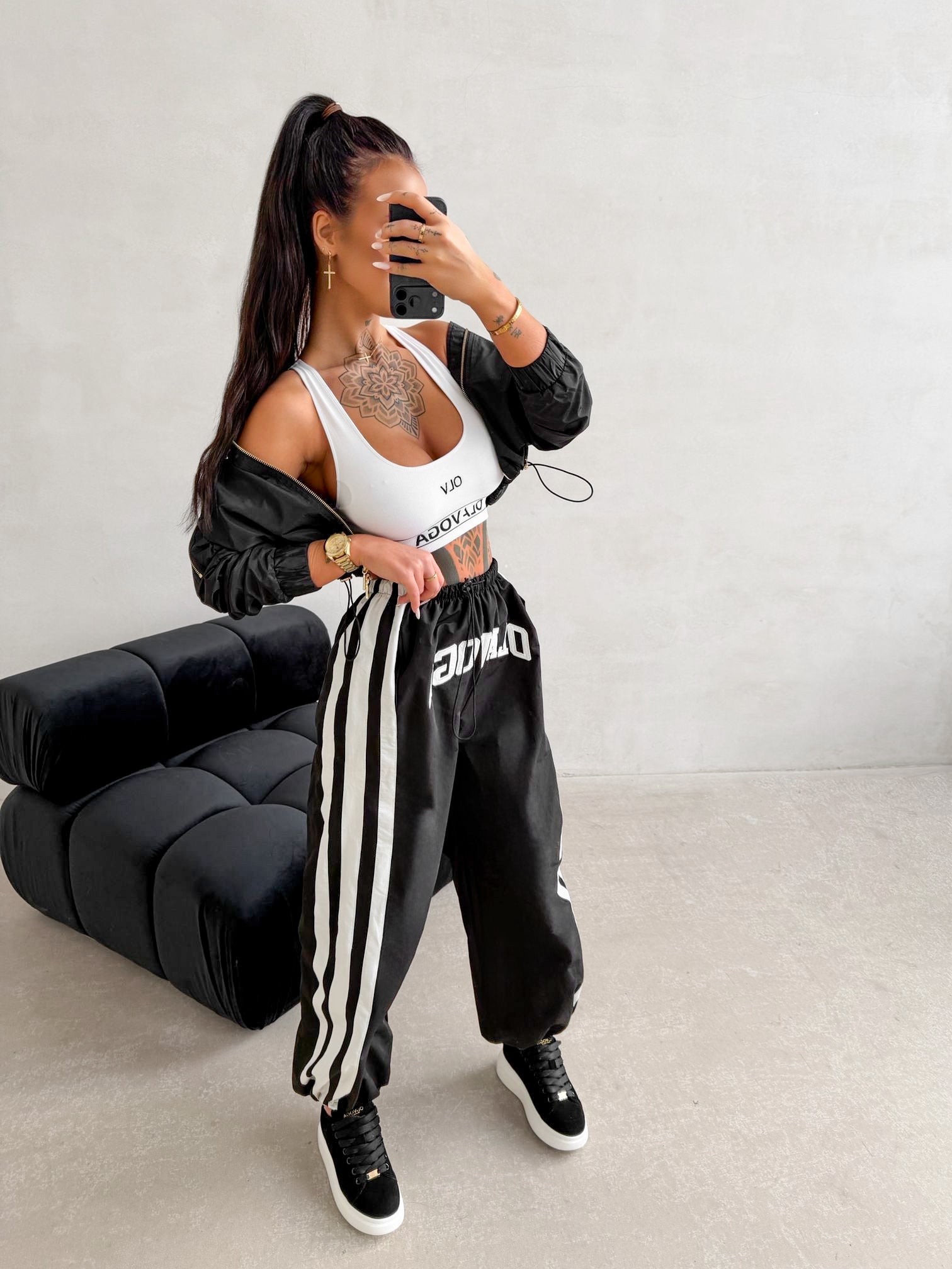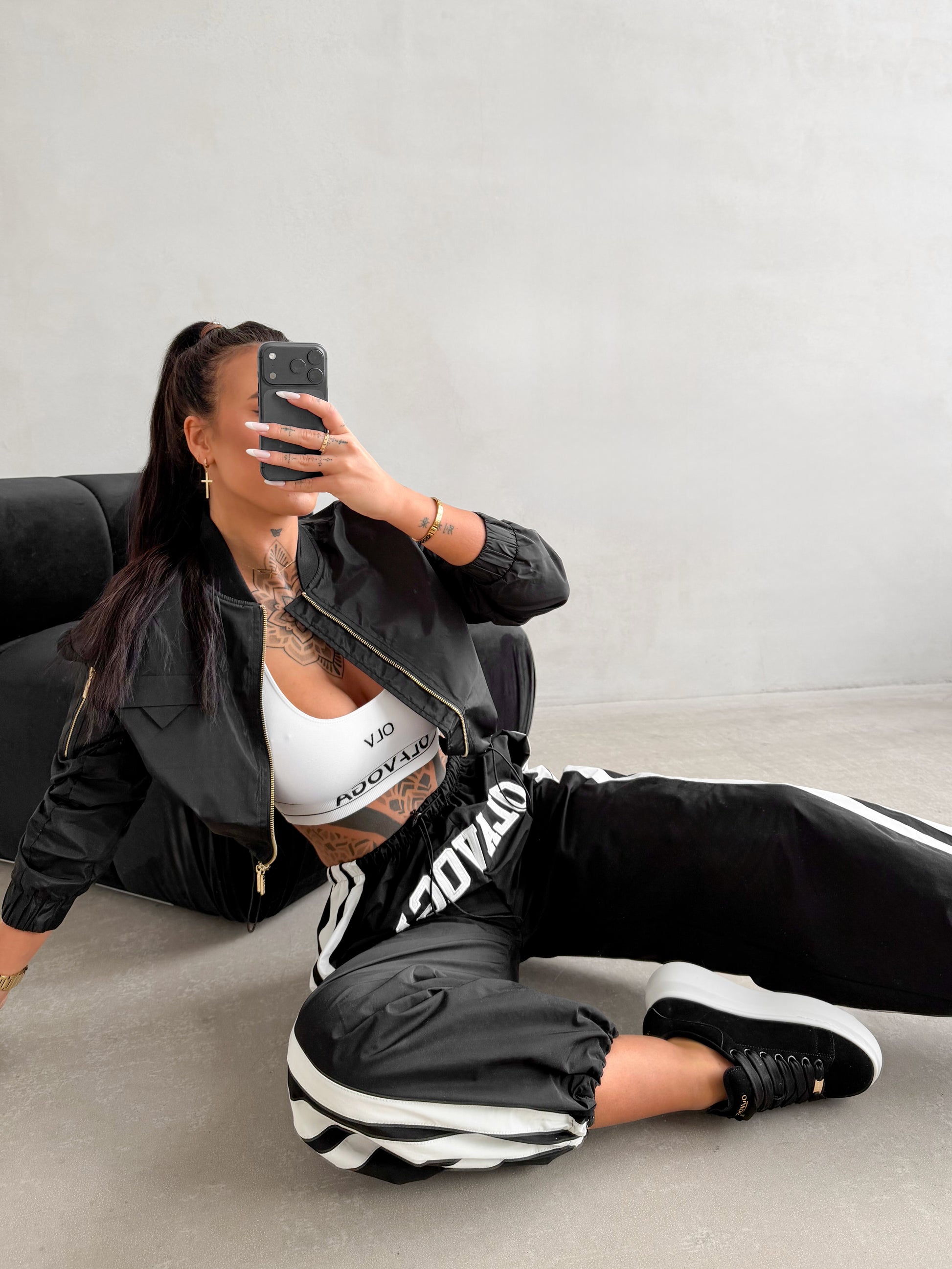 Fontos jellemzők: laza, kényelmes szabás, állítható, rugalmas derék, puha, kellemes tapintású anyag, nagy OLAVOGA logó elöl, kontrasztos csíkok oldalt, praktikus zsebek, passzés nadrágszár.