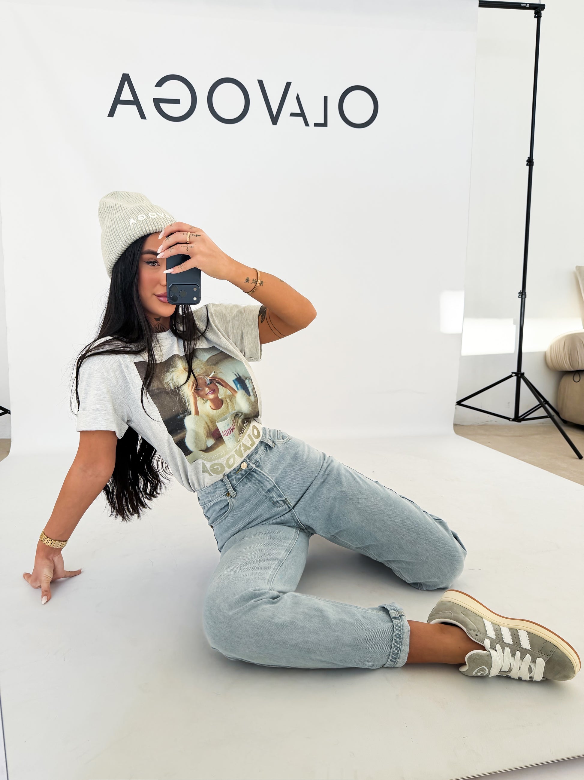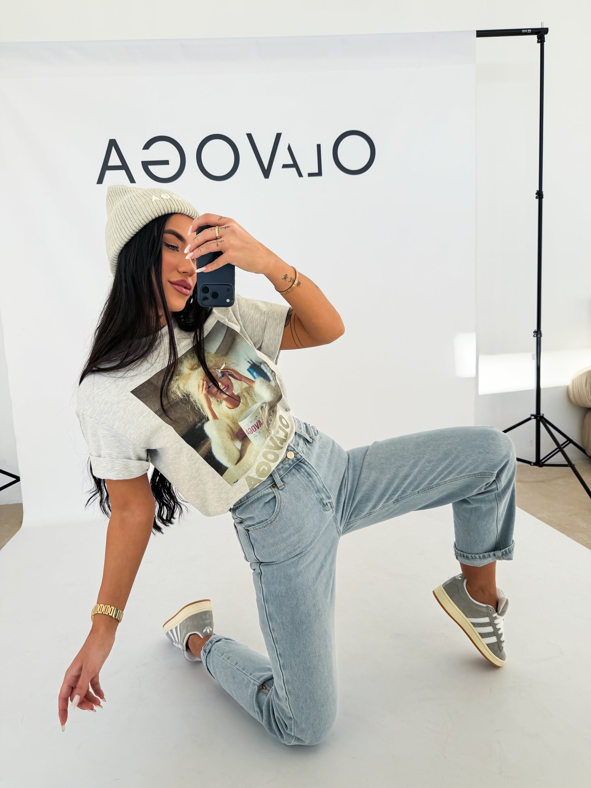 Oversize póló, kerek nyakkivágással és rövid, felhajtott ujjakkal. Látványos grafika és finom OLAVOGA logó díszíti.