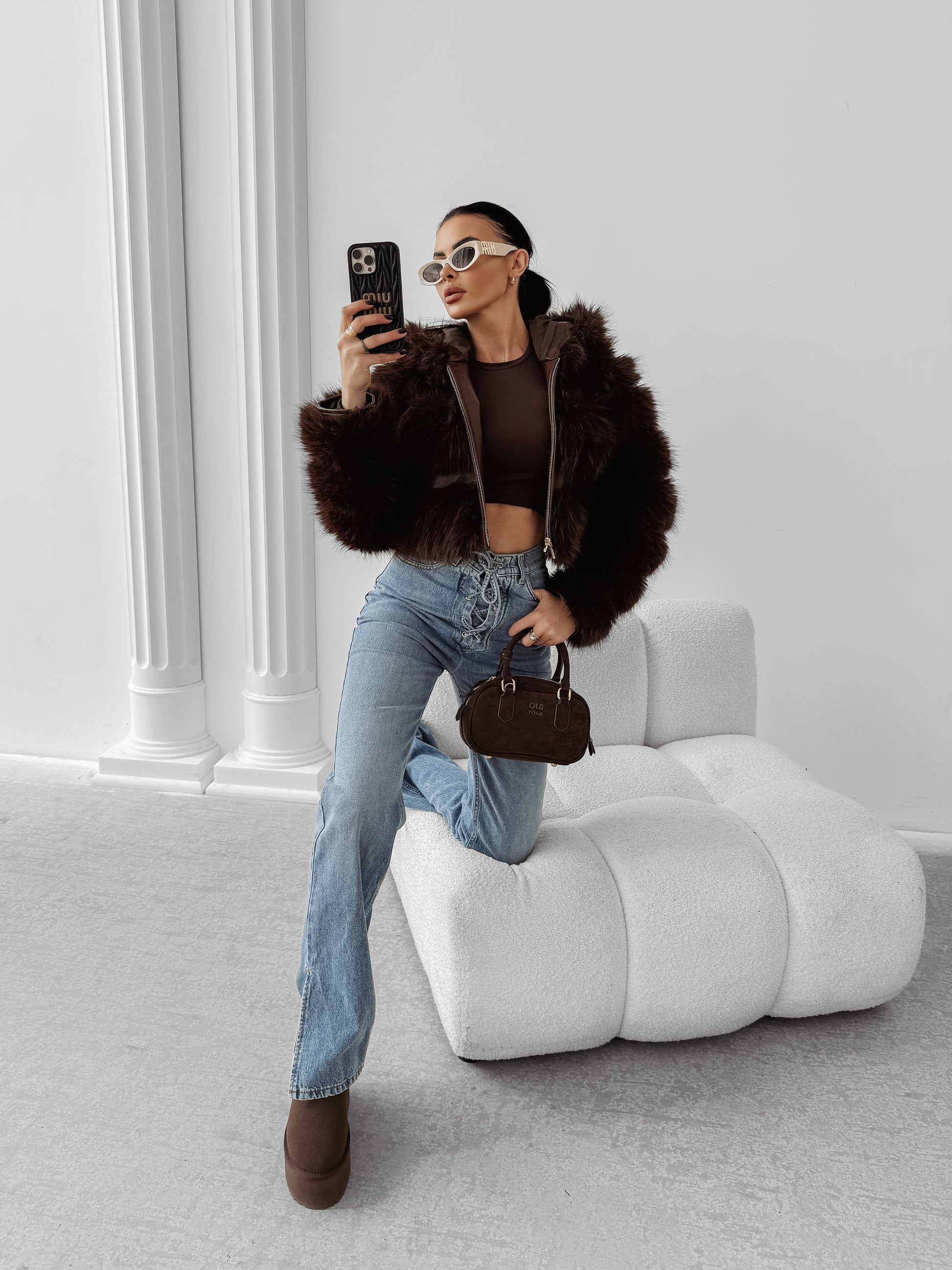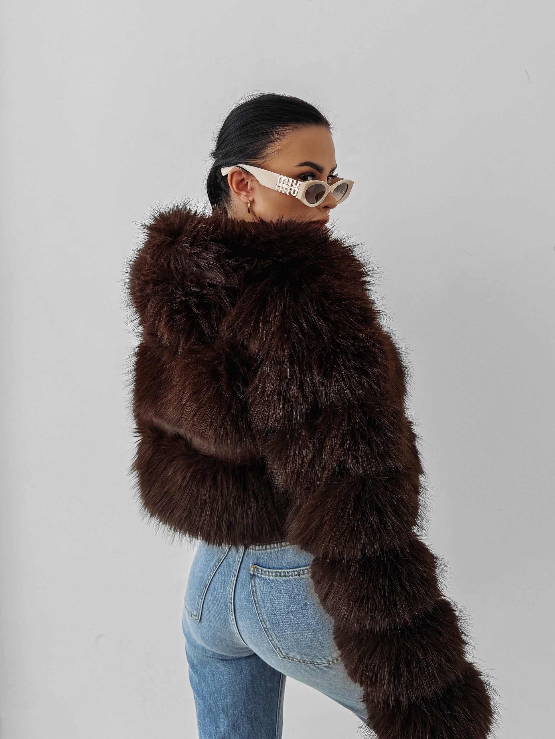 Női műszőrme kabát rövidebb fazonnal. Modern, moduláris stílusú darab – a lecipzározható ujjaknak köszönhetően viselhető klasszikus kabátként, mellényként vagy rövid ujjú változatban is. Puha, dekoratív szőrmével díszített, cipzárral záródik, praktikus kapucnival és visszafogott, aranyszínű részletekkel.