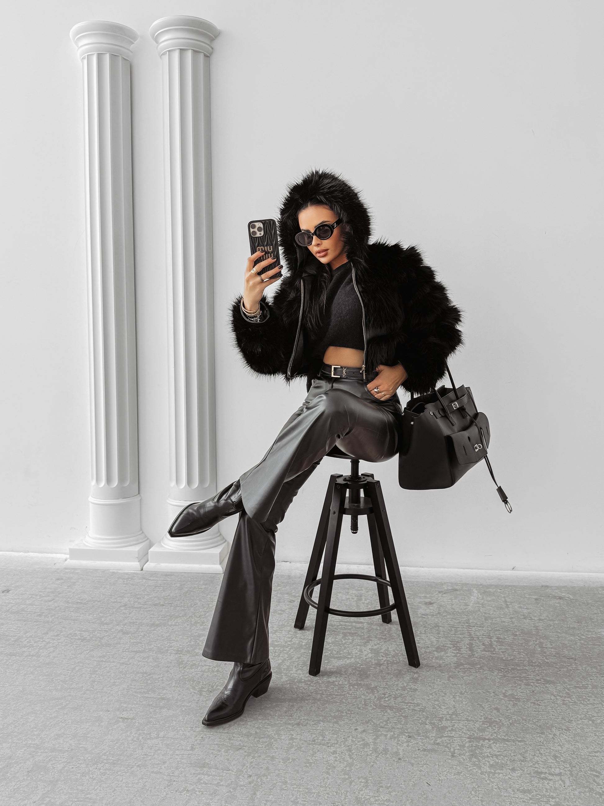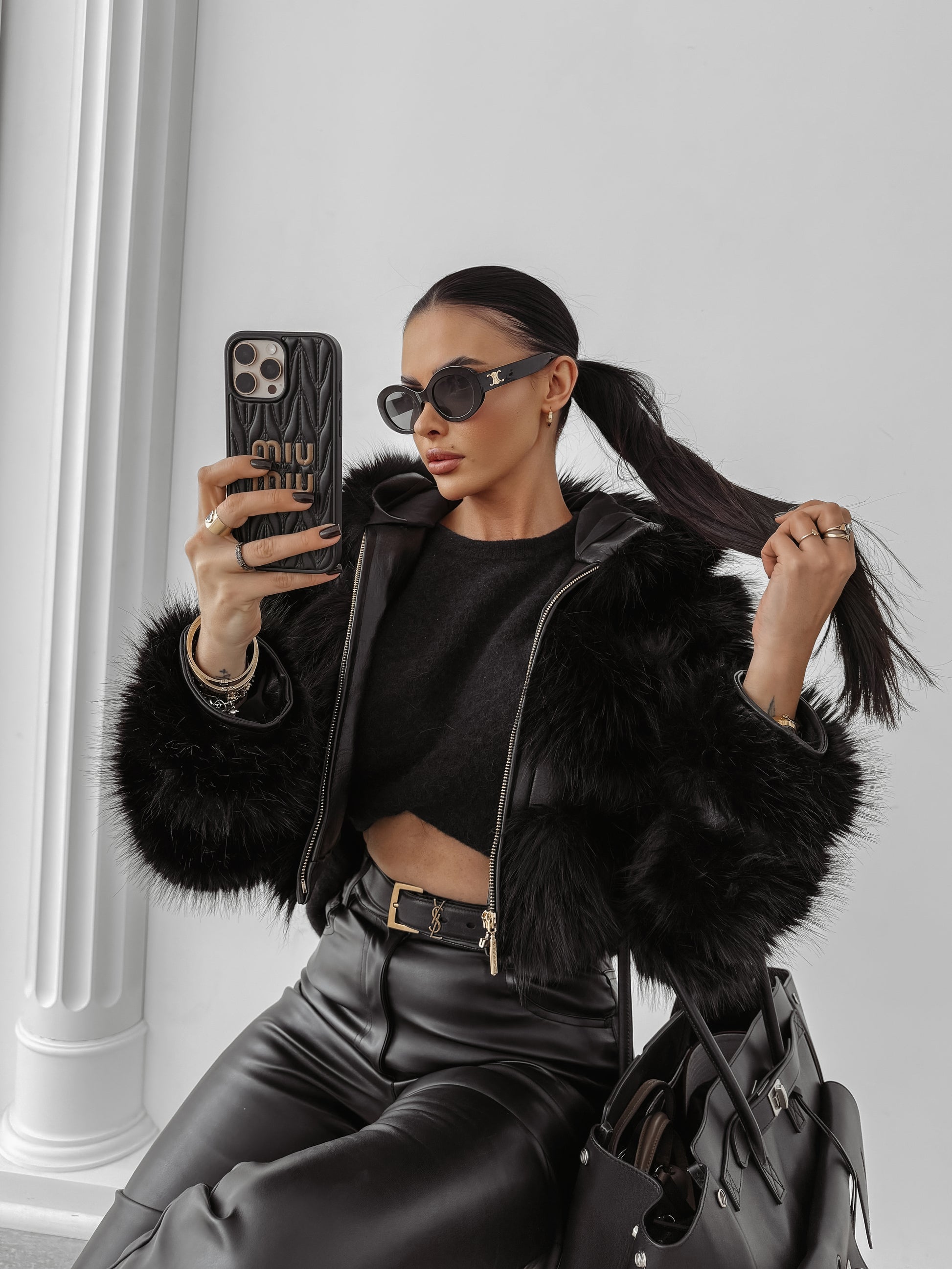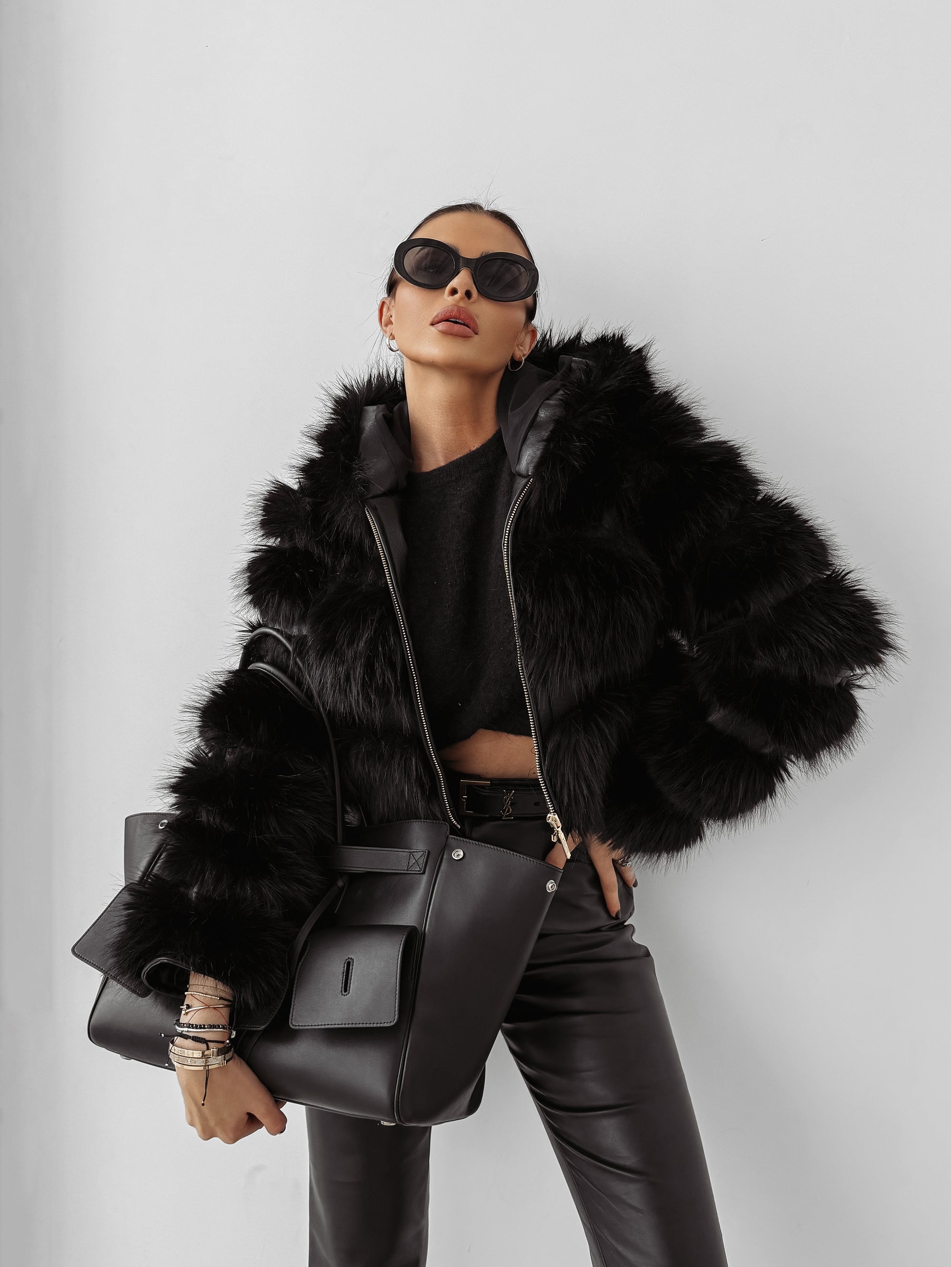 Női műszőrme kabát rövidebb fazonnal. Modern, moduláris stílusú darab – a lecipzározható ujjaknak köszönhetően viselhető klasszikus kabátként, mellényként vagy rövid ujjú változatban is. Puha, dekoratív szőrmével díszített, cipzárral záródik, praktikus kapucnival és visszafogott, aranyszínű részletekkel.