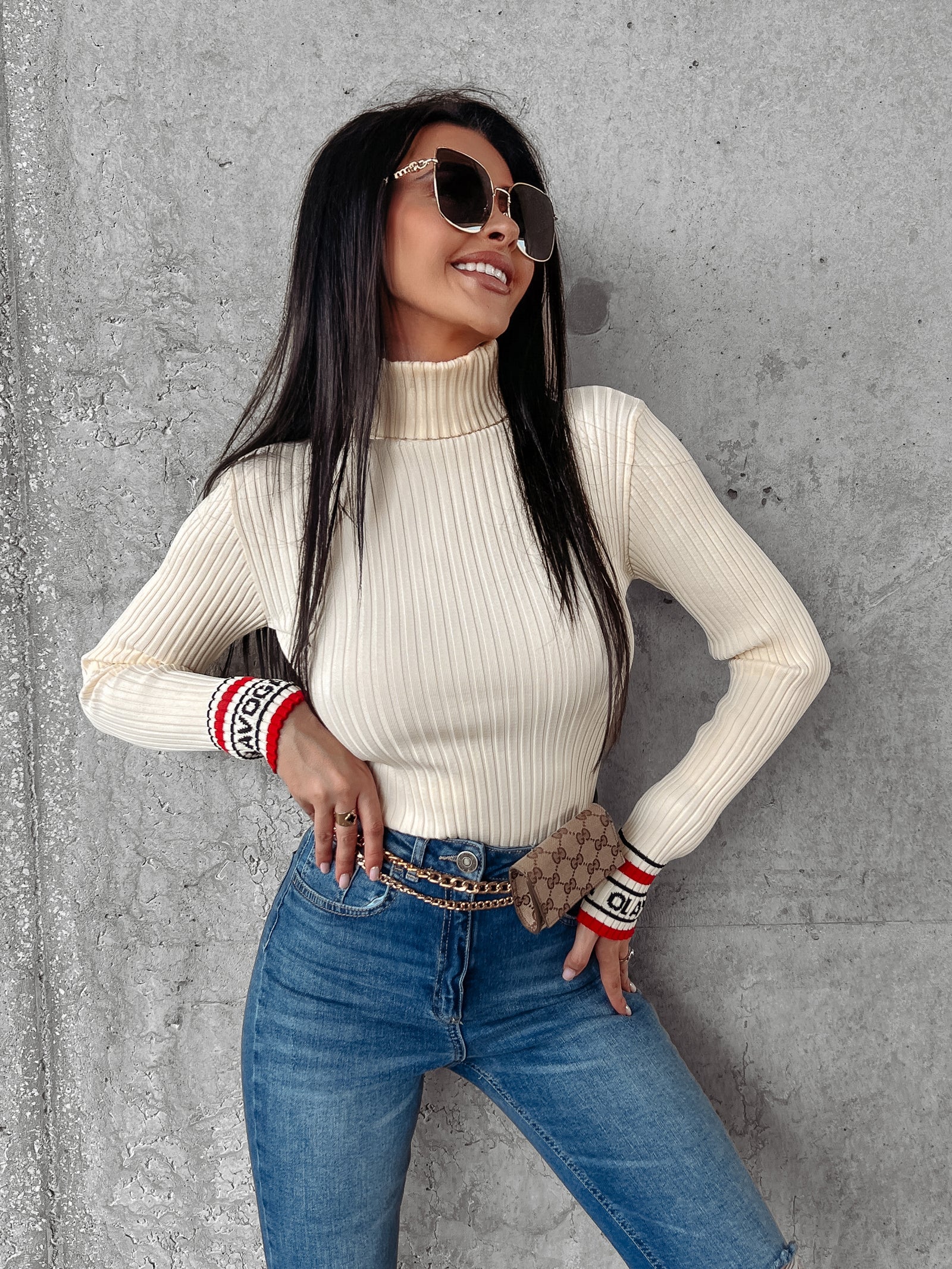 Kellemes tapintású, rugalmas bordás anyagból készült, testhezálló garbó. A mandzsettákon