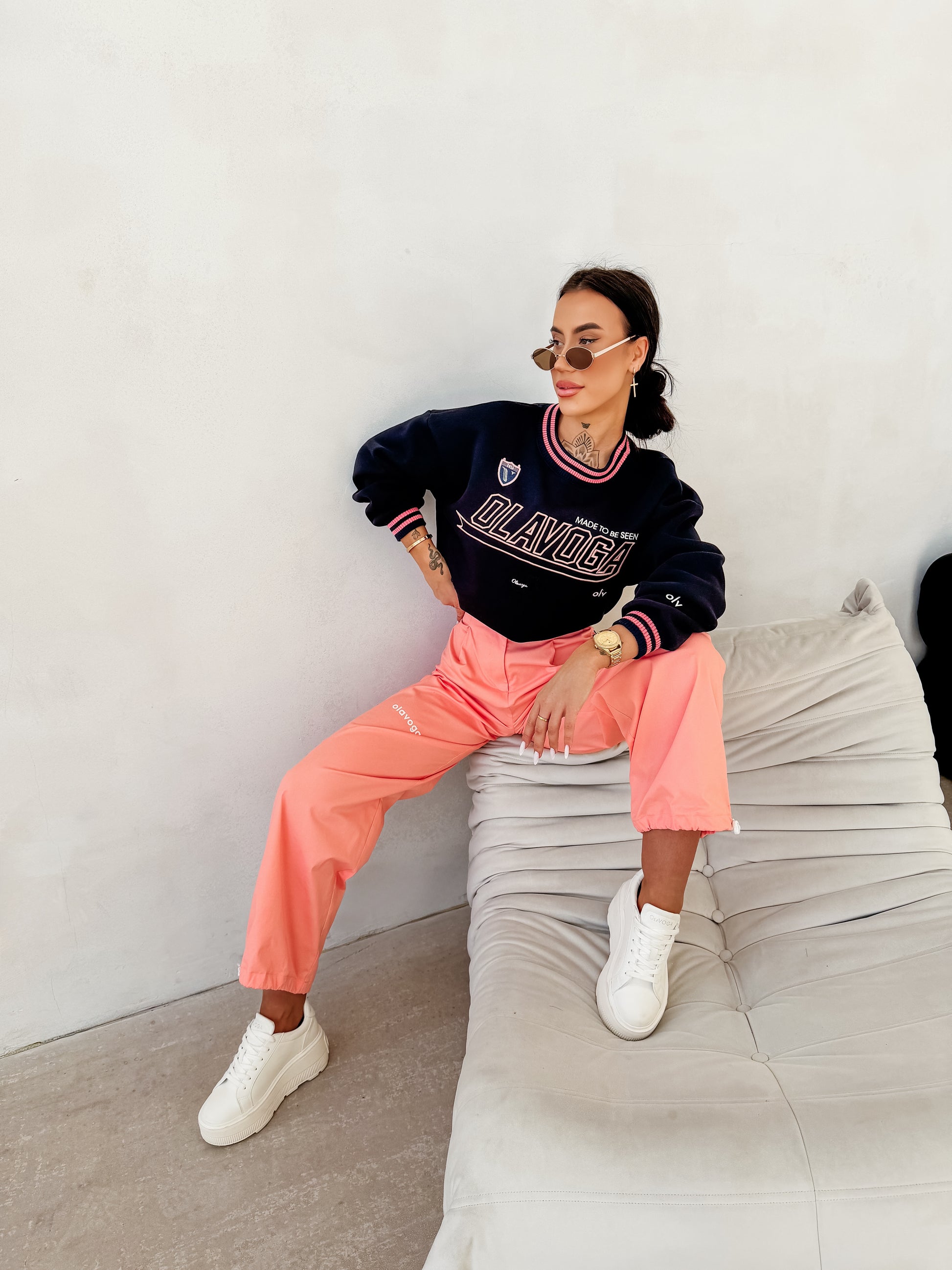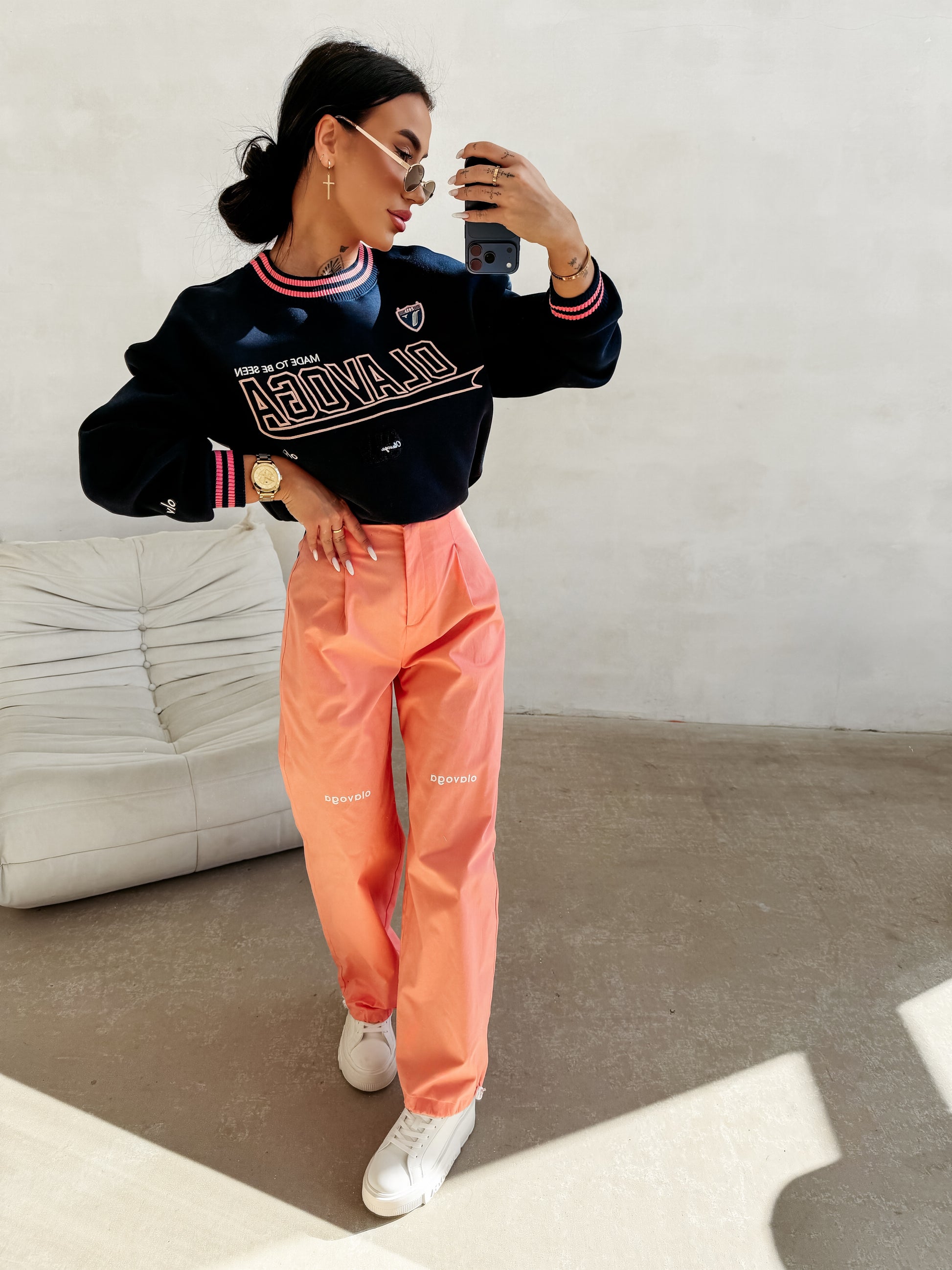 Laza nadrág, magas derékrésszel és látványos előredrapírozással. Cipzáras és gombos záródás, a szárakon finom 3D OLAVOGA logóval, hosszú szár passzéval és stopperrel záródik.