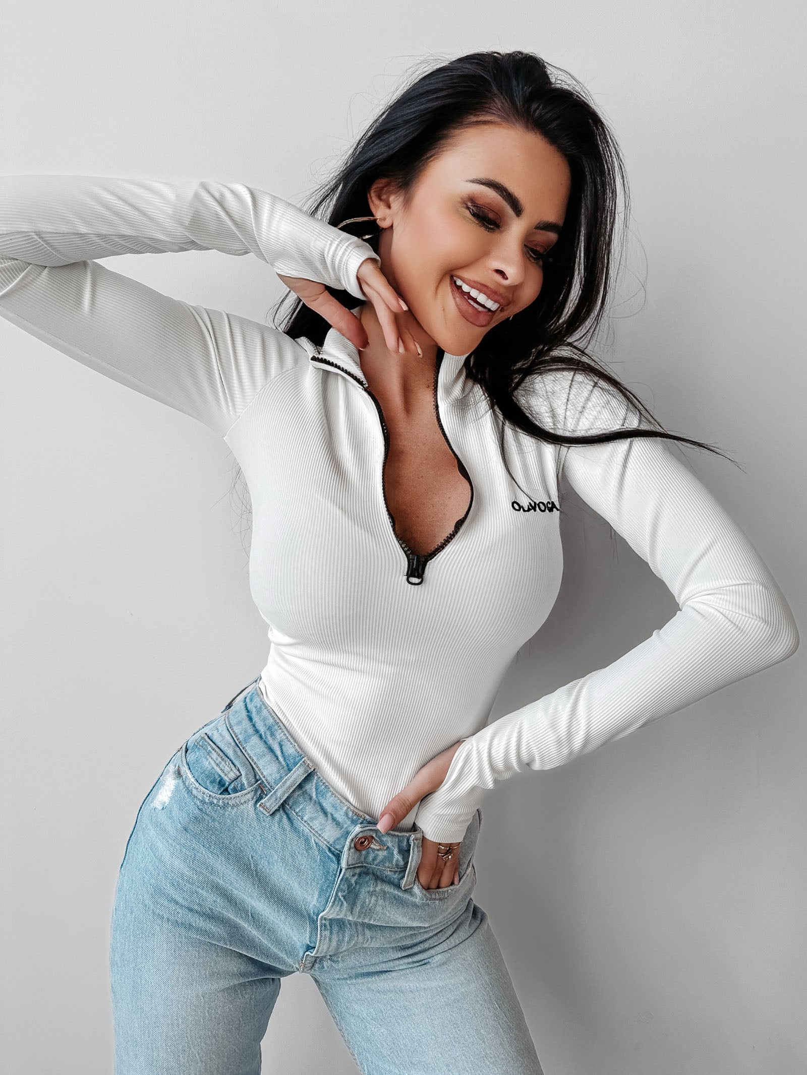 Szűk, testhezálló, hosszú ujjú blúz, cipzárral. Magas gallérú, elöl