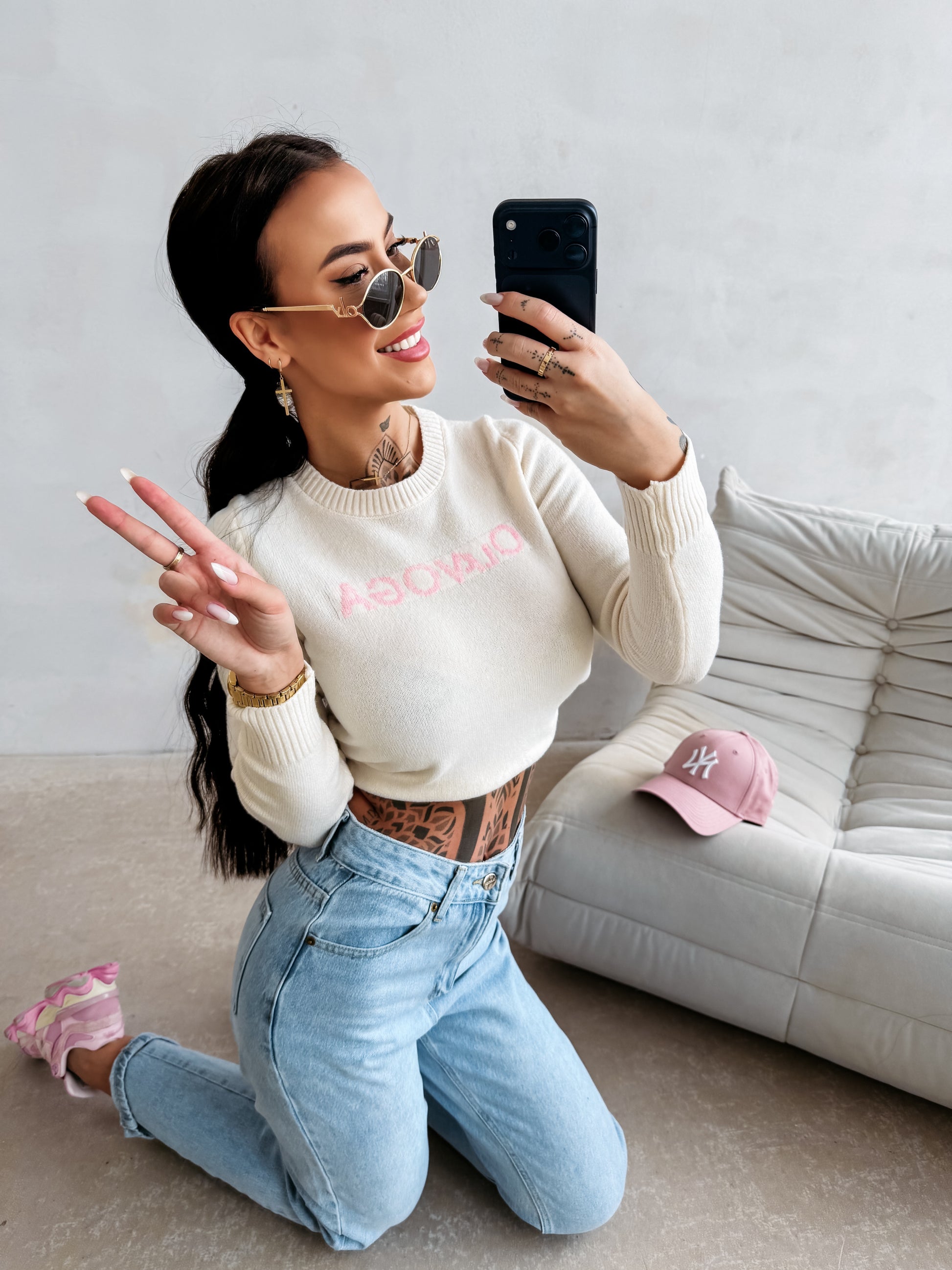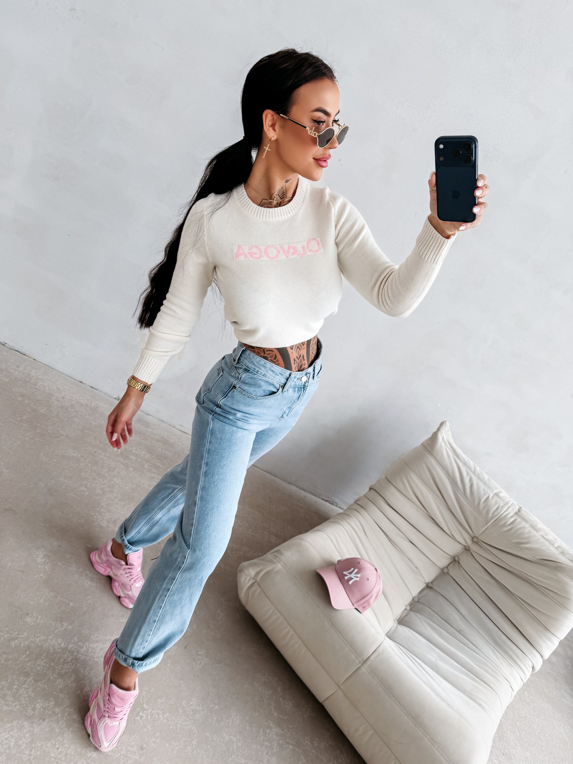 Rövid pulóver casual stílusban, hosszú ujjal és kényelmes szabással. Magas minőségű, rugalmas anyagból készült. Bordázott passzékkal díszített, elöl finom OLAVOGA logóval a kötött struktúrában.